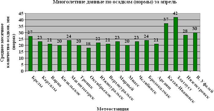 В апреле, в северной половине области выпадает 28-42 мм осадков. На остальной территории количество выпавших осадков составляет 20-27 мм. В отдельные годы количество осадков, как превышает норму в 2-5 раз (60-110 мм), так бывает и ниже нормы в 10-20 раз (0-2 мм). В апреле 2006 г. в городе Челябинске выпало осадков в 3 раза больше нормы. В апреле 1904 г. и 1991 г. – 0% месячной нормы осадков. Число дней с осадками 1 мм и более колеблется от 4 до 7. В этом месяце чаще, 7-13 дней наблюдаются смешанные осадки (мокрый снег с дождем). Количество твердых осадков (снег) в северной половине колеблется от 14 до 22 мм, на остальной территории – 5-6 мм. Дождь в апреле уже не редкость – 7-14 мм. Средняя продолжительность осадков в апреле составляет 56-99 часов. Максимальная продолжительность осадков в городе Челябинске составляет 119 часов.